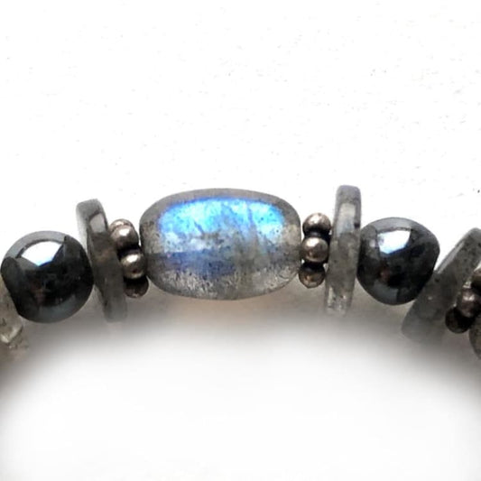 - Les pierres grises : labradorite, hématite, pyrite, sillimanite œil de chat, perle argentée…