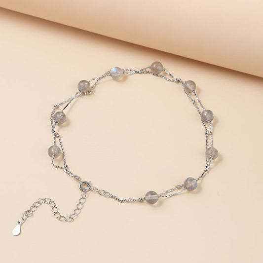Ce bracelet est composé d'une chaîne en argent sterling fin et délicat et de plusieurs perles de pierre de lune rondes et polies. Chaque perle est unique et présente des nuances subtiles de gris, blanc et bleu. Le bracelet est doté d'un fermoir en argent avec un petit anneau pour un ajustement parfait.